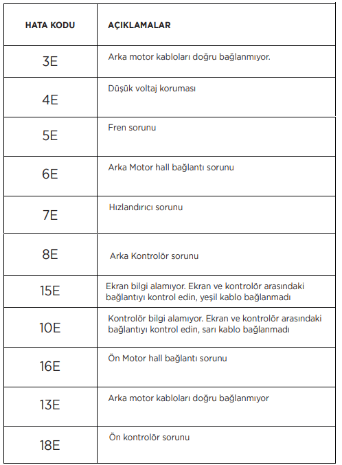 Aşağıda cihazda karşılaşabileceğiniz hata kodlarının yer aldığı yer yer almaktadır: