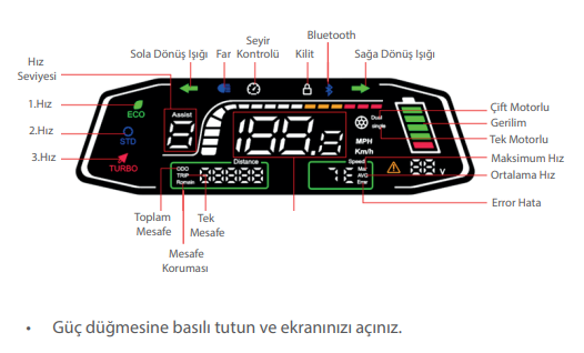TURBO: Cihazın çift motor gücü ve maksimum tork gücünüz moddur. Yokuşlarda ve hız performansında bu modu kullanmalısınız.