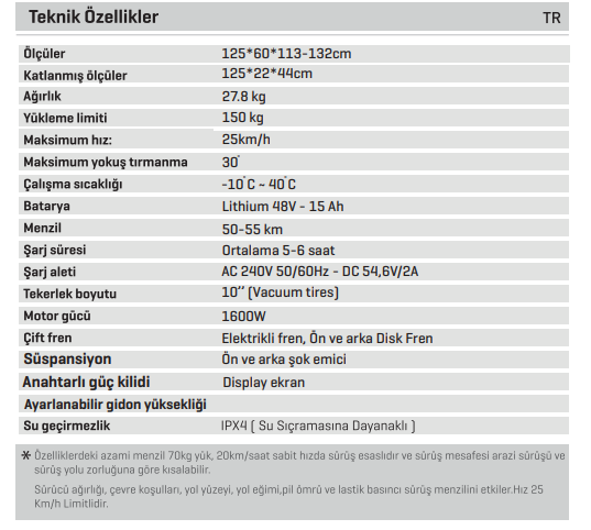 Menzil Hakkında: belirtilen 50-55 km menzil; 70 kg yük, 20 km/saat sabit hız ve düz zemin baz alınarak ölçülmüştür. Sürücü ağırlığı ve eğim aralığı menzili kısalacaktır.