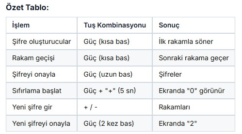 Yeni şifrenizin ilk rakamını + veya - tuşlarıyla ayarlayın → Güç düğmesiyle ikinci rakama geçin.